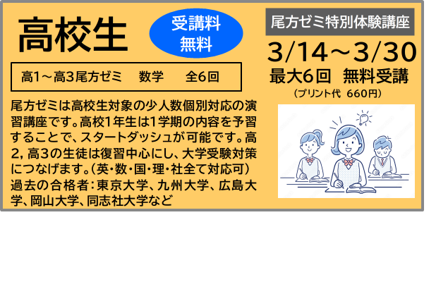 高校生対象の「尾方ゼミ」を計6回まで授業料無料で受講いただけます。さらに、新高校1年生の受講者は4月・5月の尾方ゼミ週1回の受講料が無料!